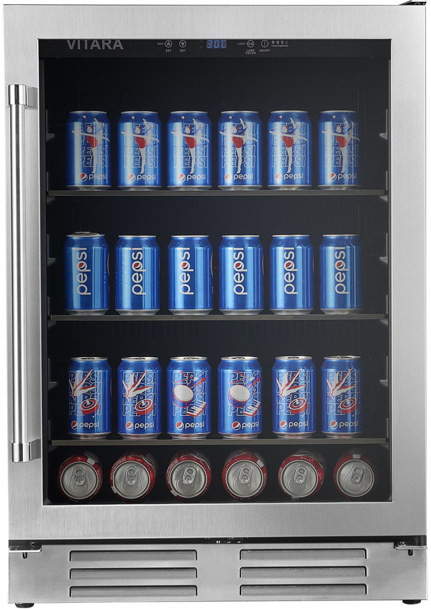 Vitara 24" Stainless Steel Beverage Center features a built-in or free standing installation and a seamless stainless steel door frame. It can hold 108 beverage cans and 6 bottles of wine.Read More