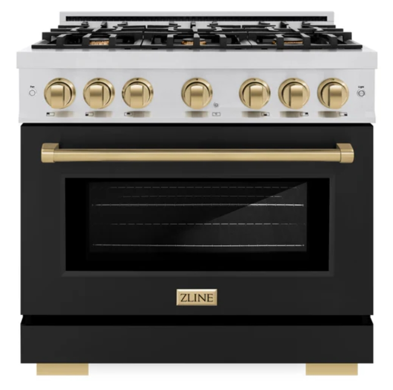 The elegance of a hand-finished porcelain gas cooktop with 6 Italian-made auto-reignition burners, an electric convection oven with an energy-efficient cooling fan to ensure quiet operation, a beautiful black matte door with a Horizon window design, and stunning champagne bronze knobs and handle allowing you to master every meal. With a modern, timeless style and refined functionality, ZLINE Select Dual Fuel Ranges are masterfully crafted to deliver an elevated culinary experience.